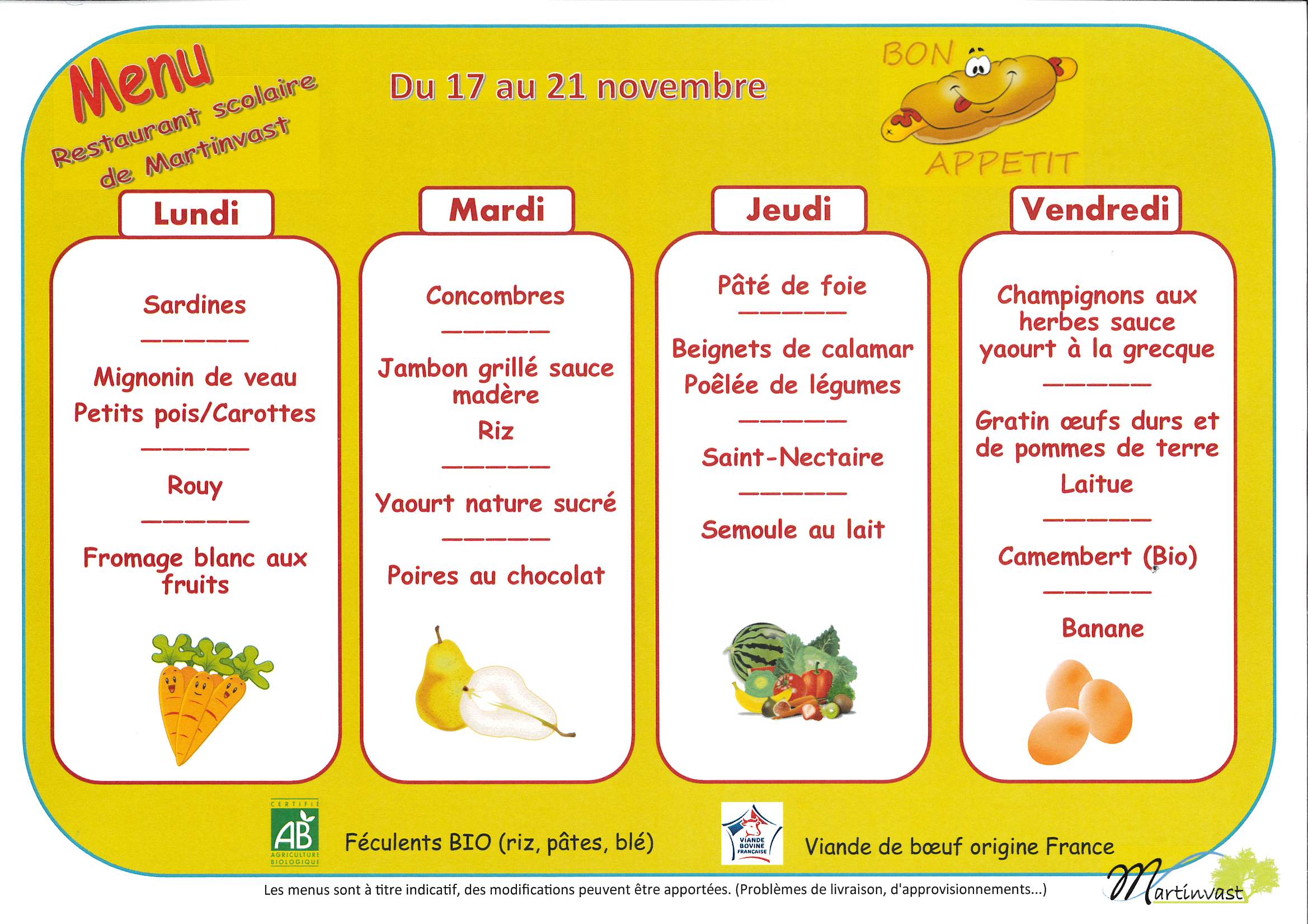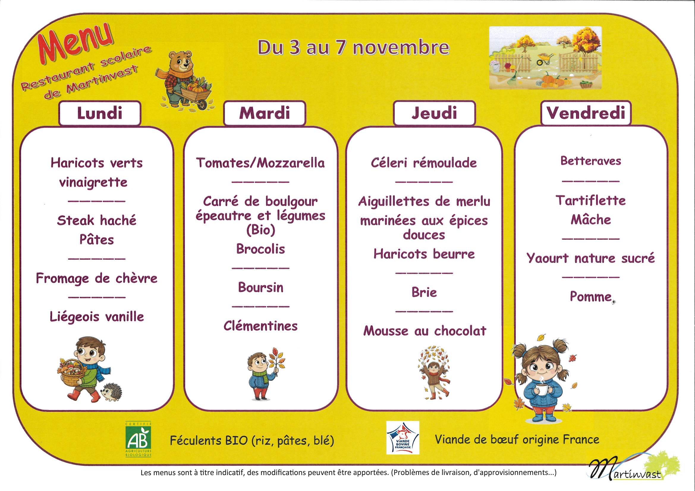 Menu du 3 au 7 novembre 2025