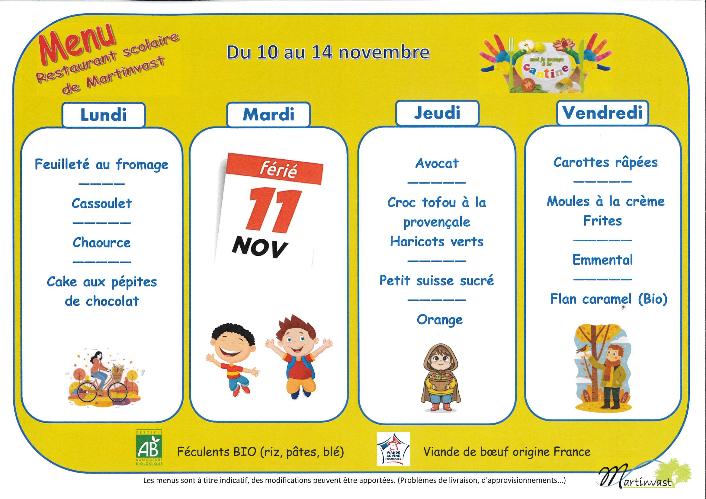 Menu du 10 au 14 novembre 2025