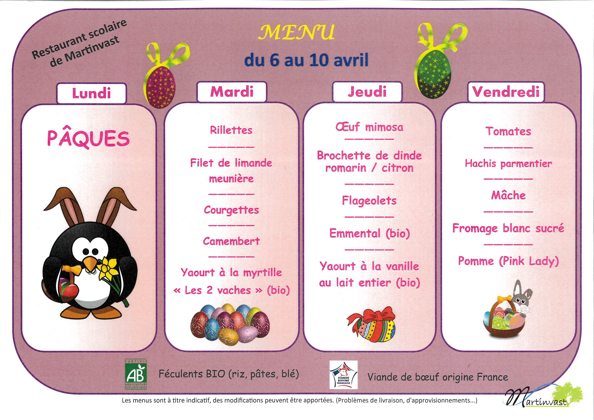 Menu du 6 au 10 avril 2026